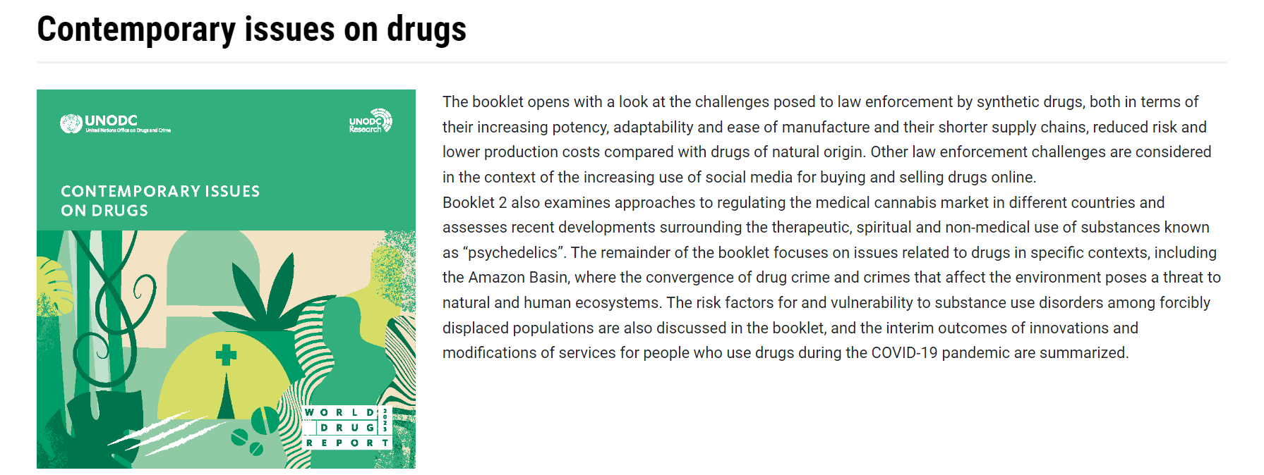 In this context, the United Nations Office on Drugs and Crime (UNODC) has recently published a report with a chapter entitled “Recent Developments Involving Psychedelics,” which is part of the World Drug Report 2023.