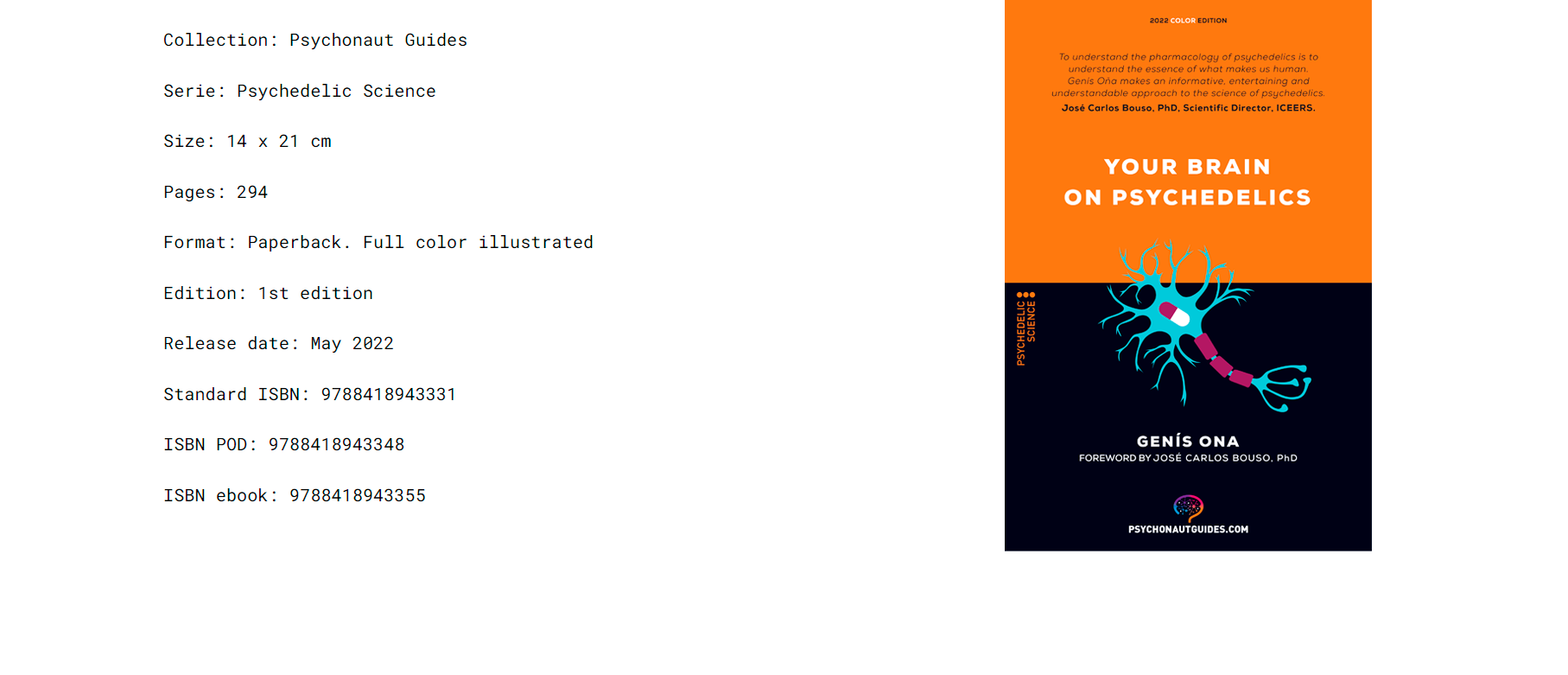 Discover the pharmacology of psychedelics. Delve into the cutting edge of scientific research on the impact of psilocybin, MDMA, DMT, mescaline and LSD on the brain. With this guide you will learn the keys to the effects of psychedelics, capable of producing significant changes in the processes of perception, thought and consciousness. An illustrated guide to understanding the science behind new psychedelic-assisted therapies for treating mental health issues. This essential guide will be of interest to all psychonauts eager to immerse themselves in the pharmacology of the most popular psychedelic molecules, to all medical and mental health professionals, and to all people interested in learning the essentials of the neuroscience of psychedelic molecules and how they affect our brains.